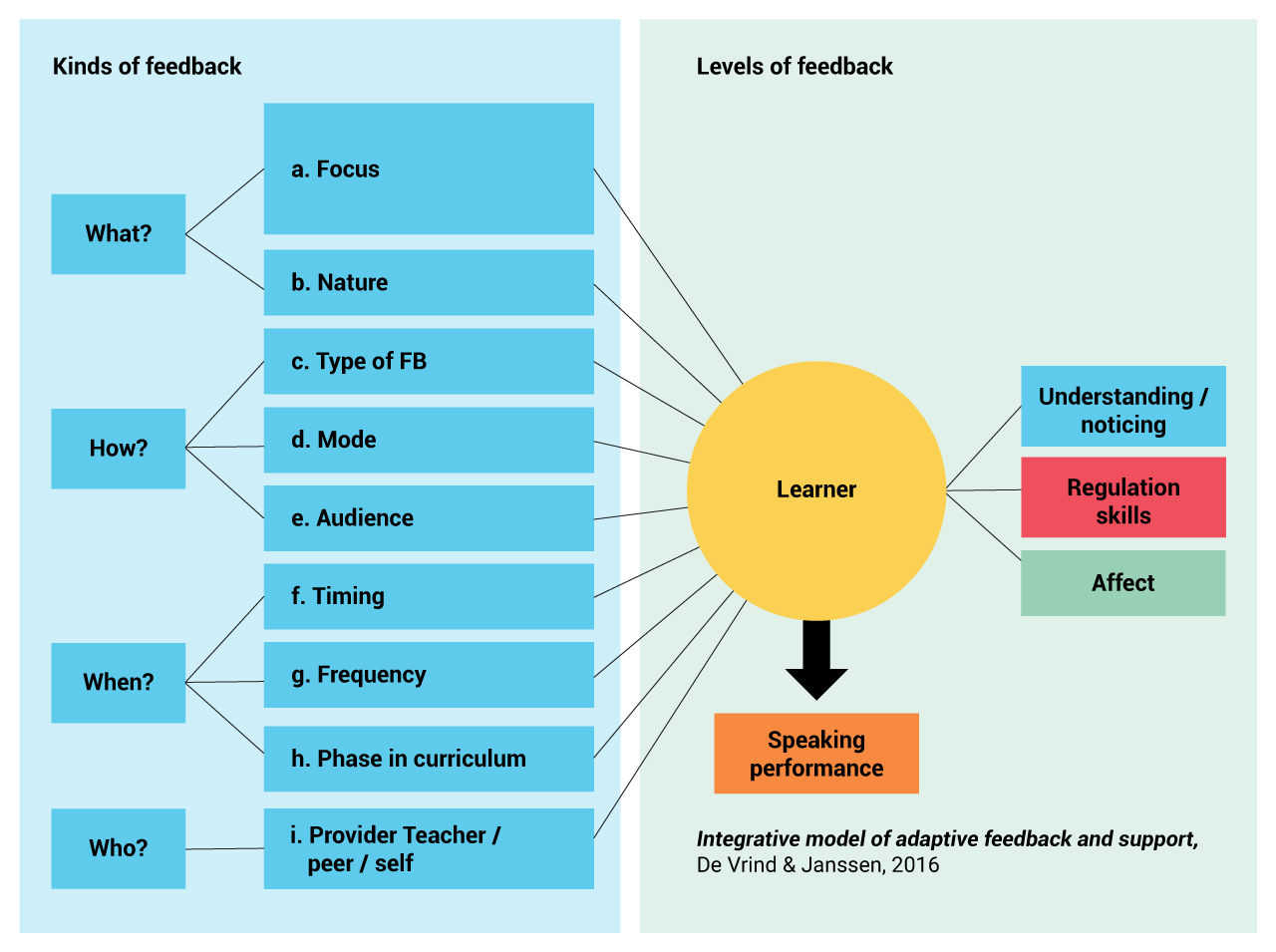 De zelfevaluatieprocedure geeft de docent ook inzicht in waar feedback op gegeven moet worden. Feedback kan daarmee gegeven worden op de spreekprestatie zelf, én, door het inzicht verkregen door de zelfevaluatie, ook op de andere feedbackniveaus (zie model).